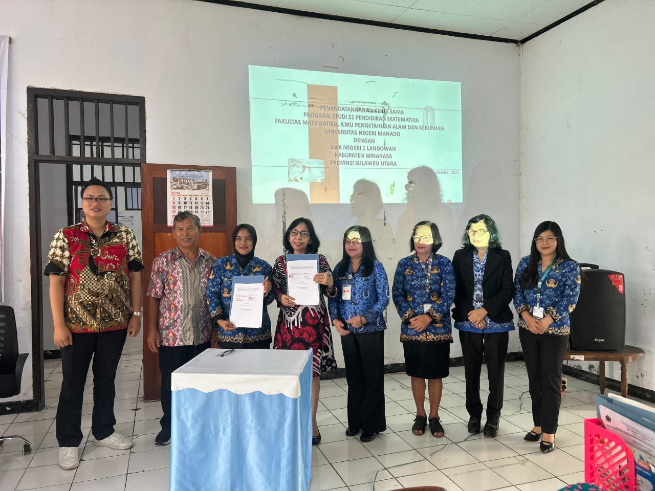 Acara ini juga dihadiri Ketua Jurusan Matematika UNIMA, Dra. Vivian E. Regar, M.Si., yang sekaligus melakukan penandatanganan kerja sama bidang pengabdian masyarakat antara jurusan yang dipimpinnya dengan SMK Negeri 1 Langowan.