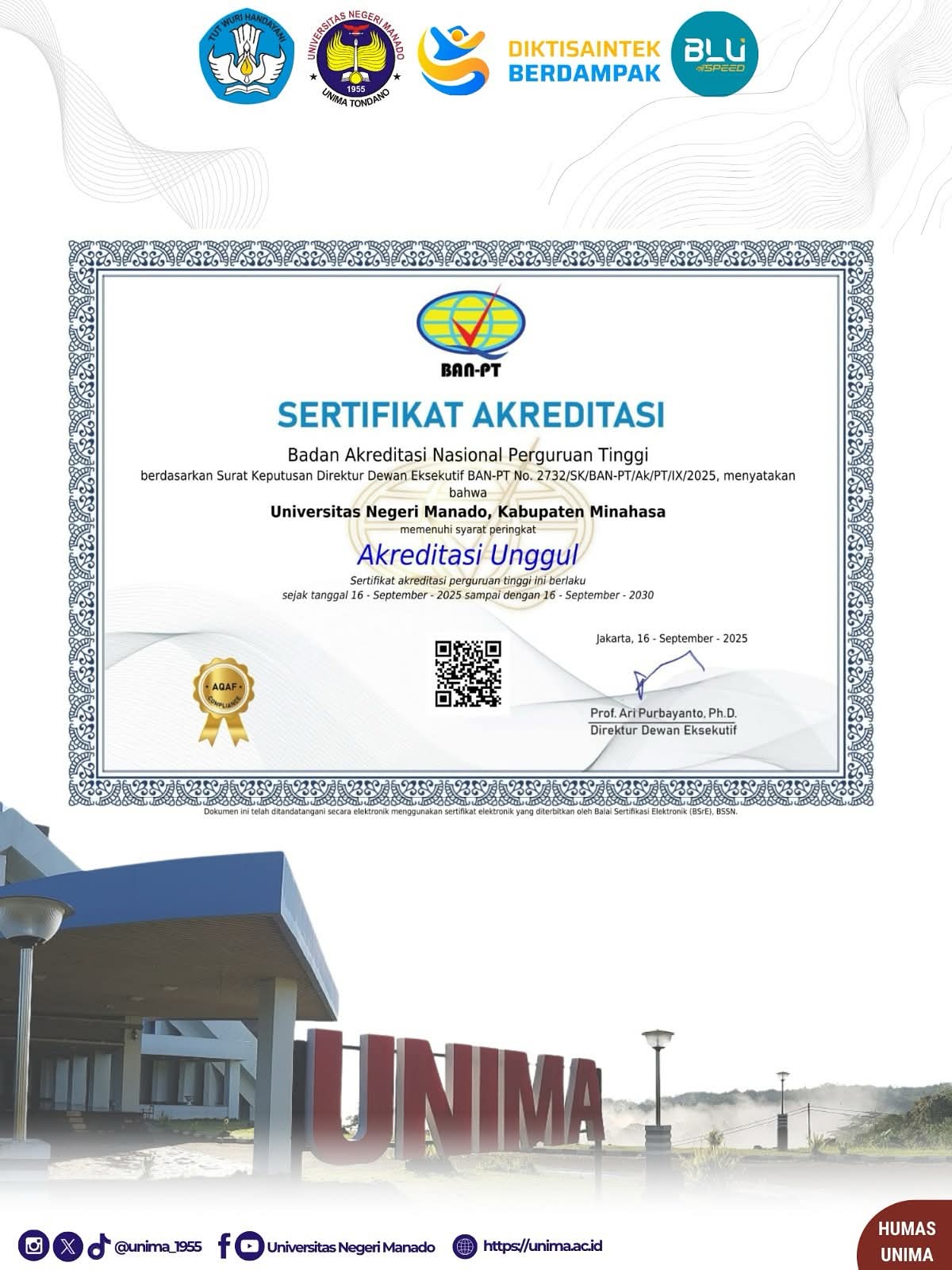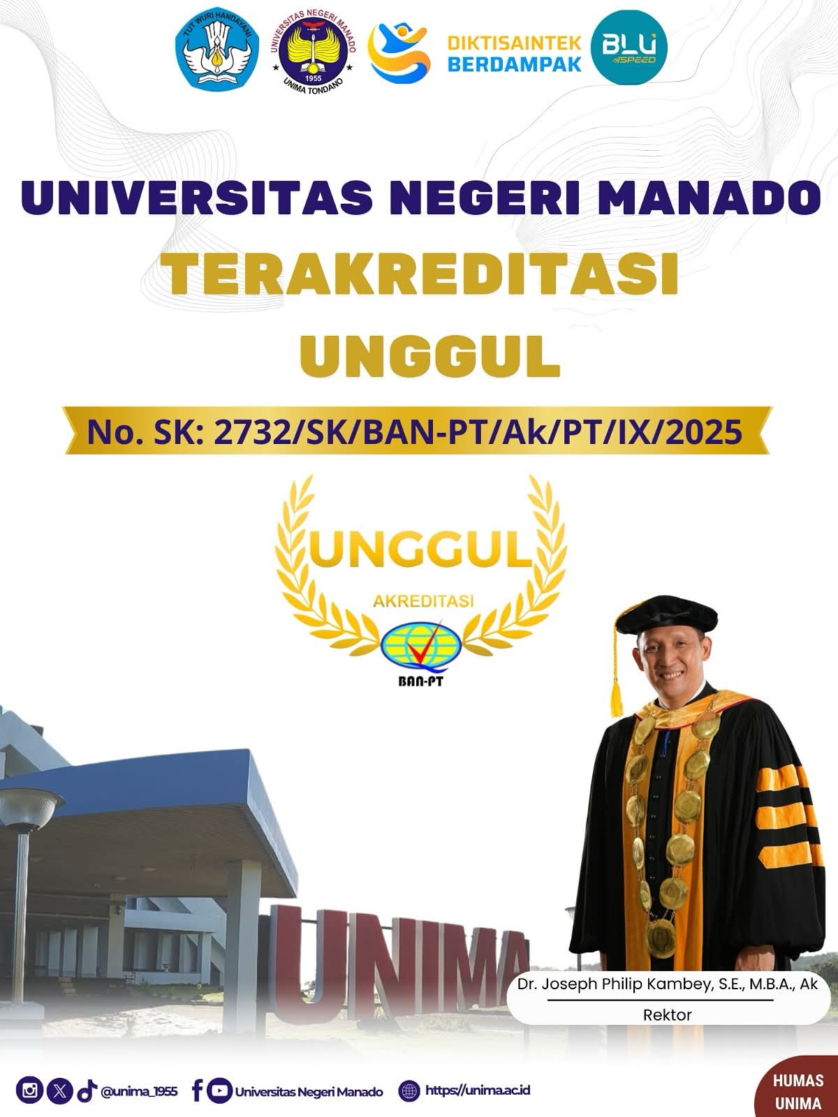 “Melalui SK BAN-PT Nomor 2732/SK/BAN-PT/Ak/PT/IX/2025, Unima resmi menyandang predikat Unggul. Ini sebuah pencapaian luar biasa yang kita syukuri bersama,” ungkap rektor, disambut tepuk tangan hadirin.