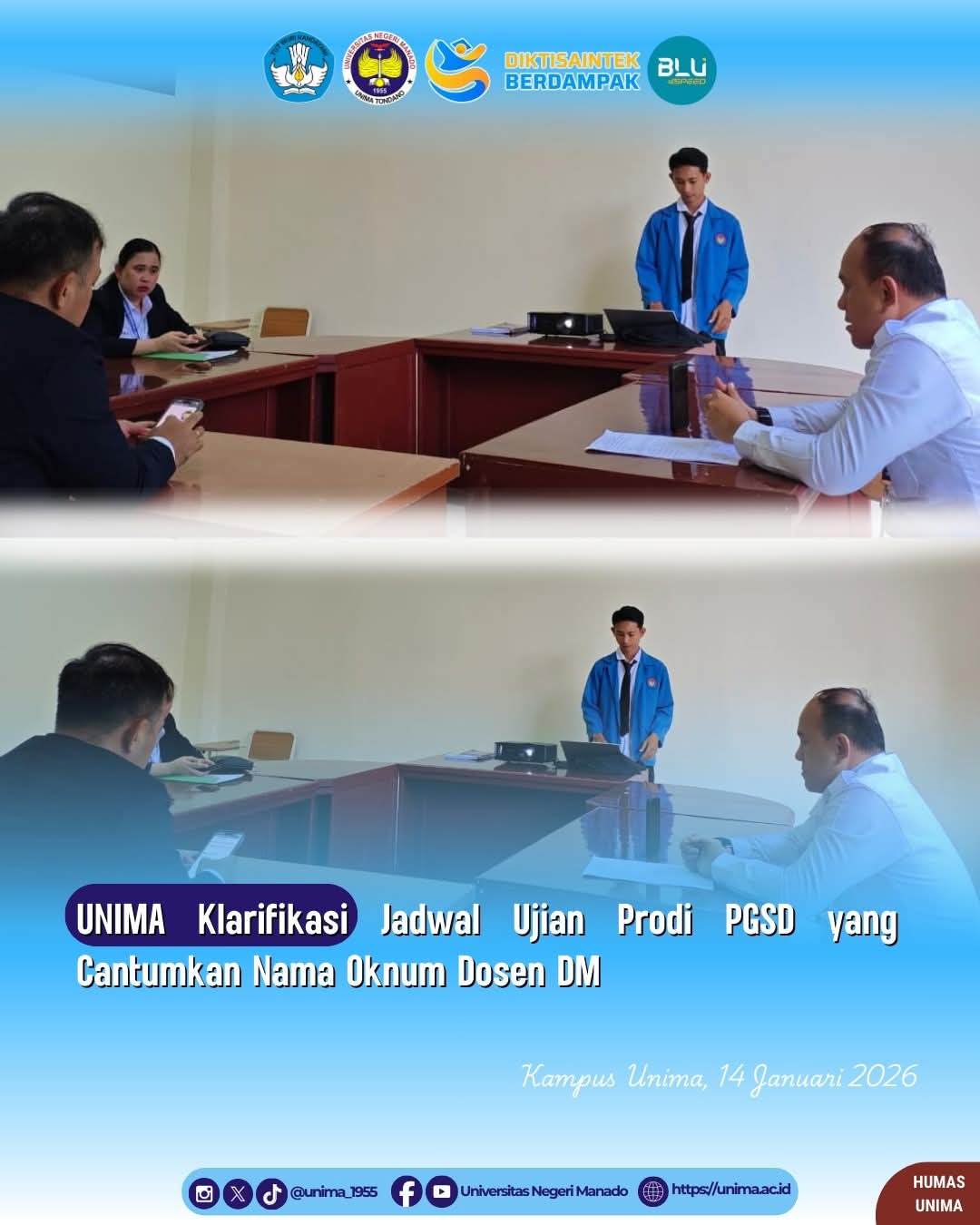 TONDANO (Gawai.co) — Universitas Negeri Manado (Unima) memberikan klarifikasi resmi terkait beredarnya jadwal dan daftar hadir penguji Seminar Hasil Penelitian Skripsi Program Studi Pendidikan Guru Sekolah Dasar (PGSD), Fakultas Ilmu Pendidikan dan Psikologi (FIPP), yang mencantumkan nama oknum dosen berinisial DM sebagai dosen penguji. Dokumen tersebut viral di media sosial dan memicu polemik publik.