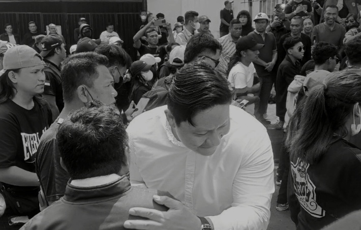 BITUNG (Gawai.co) – Aksi simpati Wakil Ketua DPRD Kota Bitung, Ronald Gunawan Kansil disela-sela aksi demo Aliansi Bitung Bergerak didepan pintu gerbang Kantor DPRD Kota Bitung. Rabu (03/09/2025).
