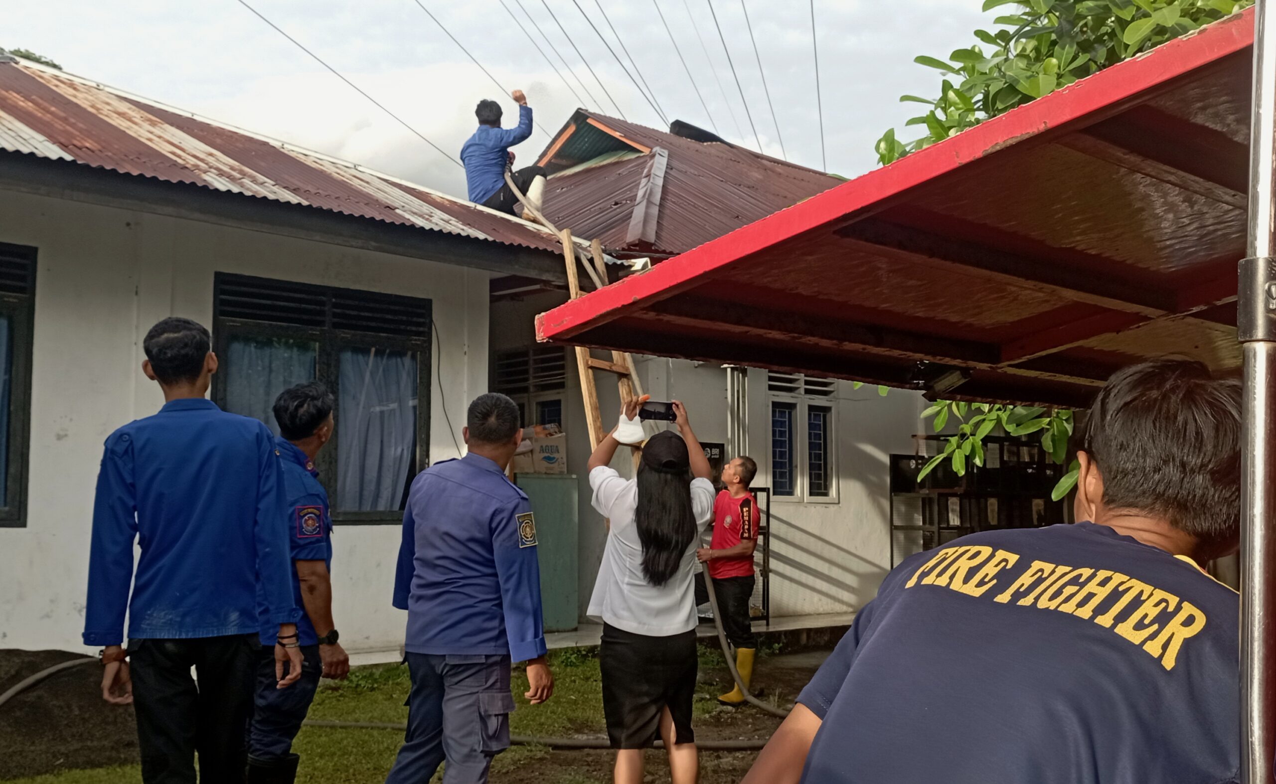 “Saya kaget melihat asap dari atap seng gedung, padahal saya tidak merokok. Setelah saya dekati, ternyata asap itu berasal dari balok kayu di atap bangunan,” ujar pekerja tersebut dengan nada panik.