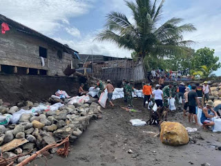 | Warga di Pesisir Pantura Bolmong Gotong Royong Membuat Penahan Ombak. (Foto: Ist) |