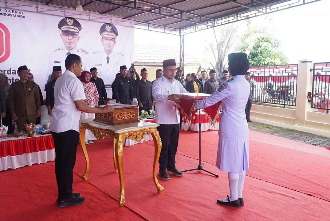 Boltara — Menjelang peringatan Hari Ulang Tahun (HUT) ke-80 Kemerdekaan Republik Indonesia, Bupati Bolaang Mongondow Utara (Boltara), Dr. Sirajudin Lasena, secara resmi menyerahkan duplikat bendera Merah Putih kepada Pasukan Pengibar Bendera Pusaka (Paskibraka) Boltara. Prosesi khidmat ini berlangsung di Rumah Dinas Bupati, Sabtu (16/8/25).