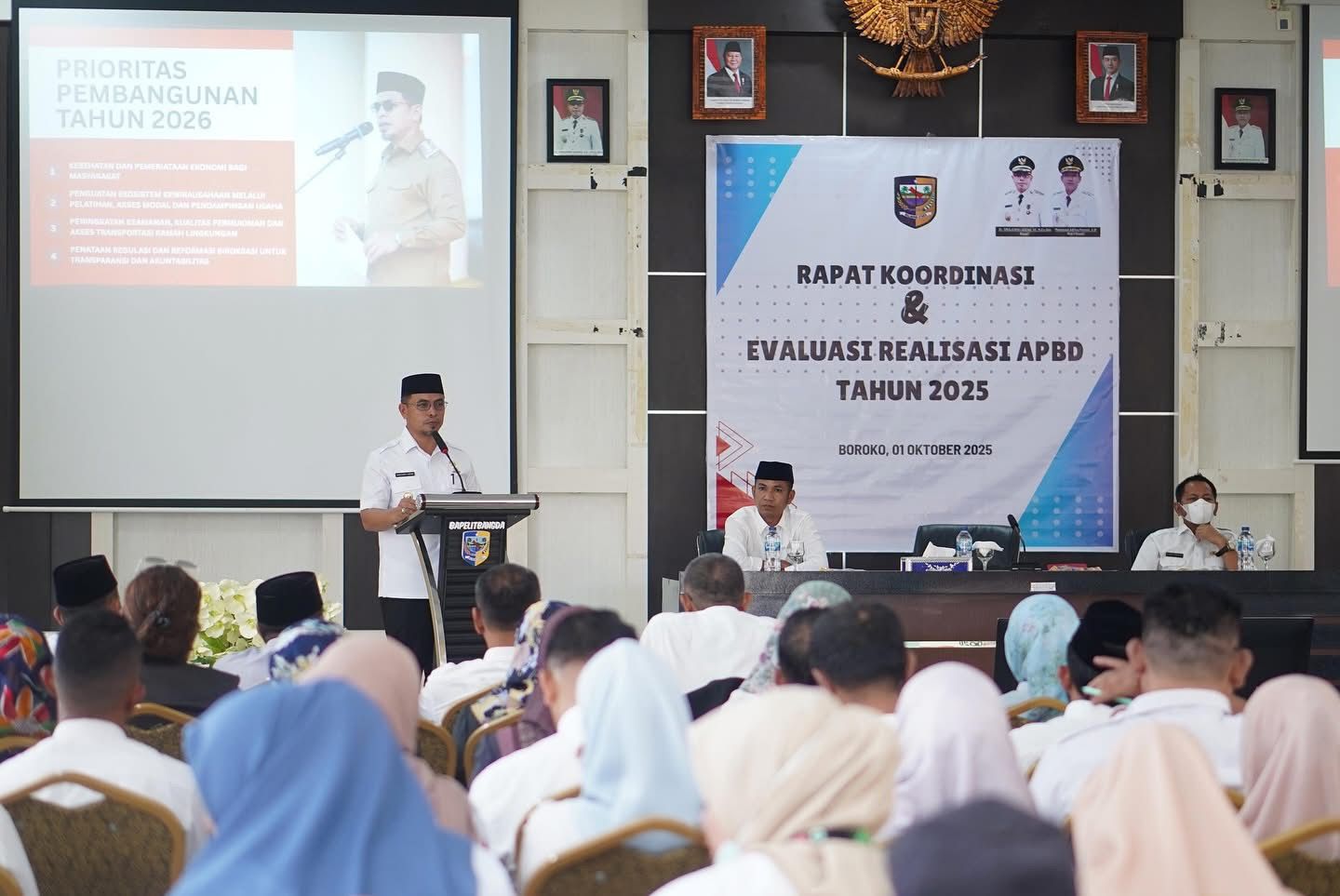 Botara —Bupati Bolaang Mongondow Utara (Boltara), Dr. Sirajudin Lasena, memimpin langsung Rapat Koordinasi dan Evaluasi Realisasi APBD Tahun 2025 yang digelar di Aula Bapelibang Boltara, Rabu (1/10/25).