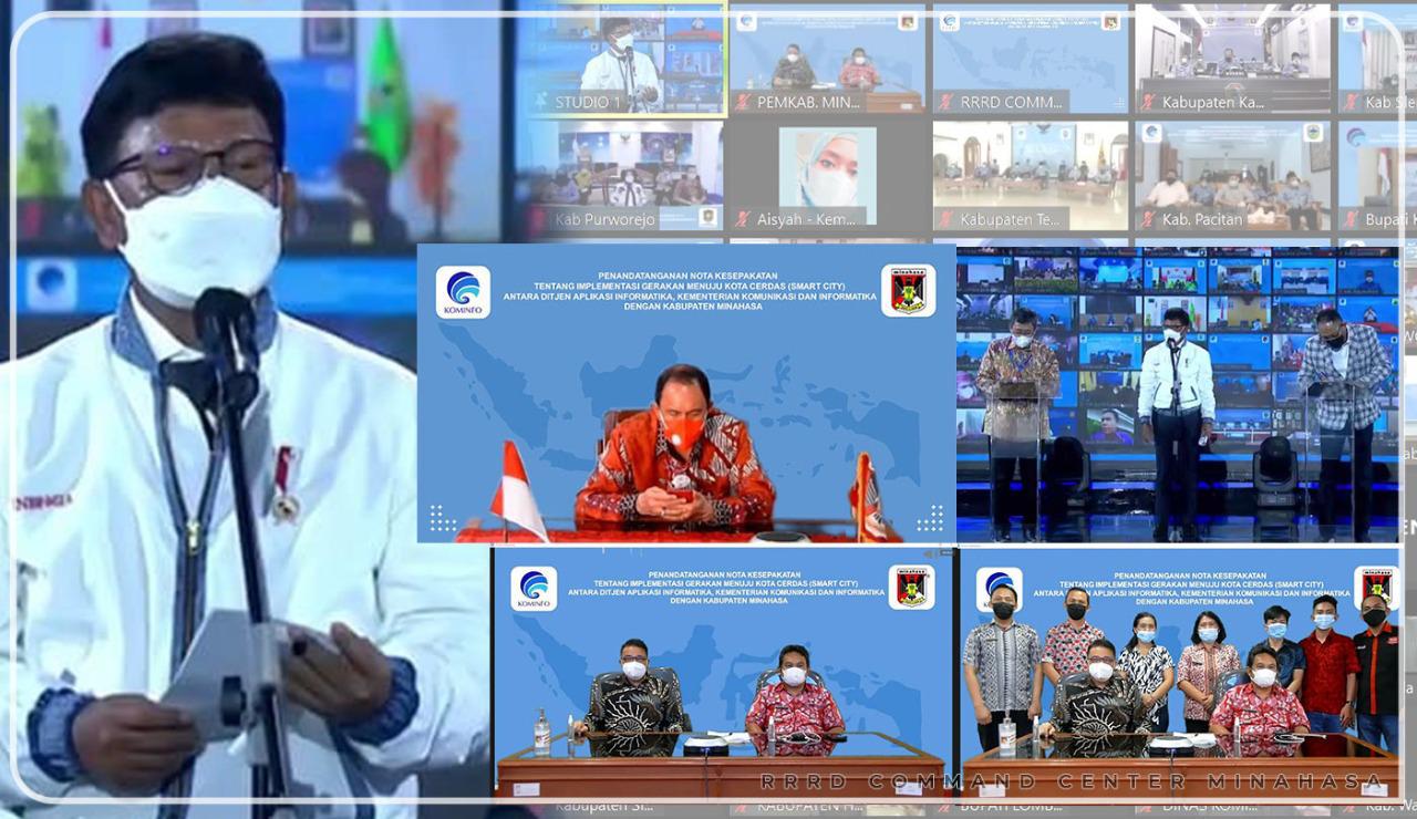 TONDANO (Gawai.co) – Bupati Minahasa Dr. Ir. Royke Octavian Roring MSi (ROR) mengikuti kegiatan Penandatanganan Nota Kesepakatan Implementasi Kota Cerdas (Smart City) tahun 2021 bagi 48 kabupaten/kota di Kawasan Pariwisata Prioritas Nasional dan Kawasan Ibu Kota Negara Baru yang dipilih dan ditetapkan oleh Kementerian Komunikasi dan Informatika RI, pada Kamis (20/5) secara virtual.
