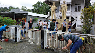 Pengurus PWI Minahasa membersihkan tugu pers Mendur di Kawangkoan. (ist)