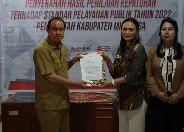 TONDANO (Gawai.co) – Ombudsman perwakilan Sulawesi Utara menyerahkan hasil penilaian kepatuhan terhadap standar pelayanan publik tahun 2022, kepada Pemkab Minahasa yang diterima langsung Bupati Minahasa, Royke Octavian Roring.