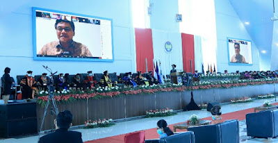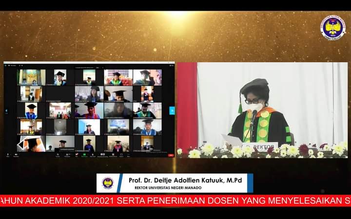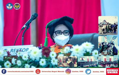 Prof Dei menyampaikan, acara wisuda Unima kali ini mendapat kehormatan yang luar biasa karena dihadiri Sekjen Kemendikbud Prof. Dr. Ainun Naiim, MBA, PhD lewat virtual conference serta perwakilan Pemerintah Provinsi Sulut dan Pemerintah Kabupaten Minahasa dan undangan lainnya.