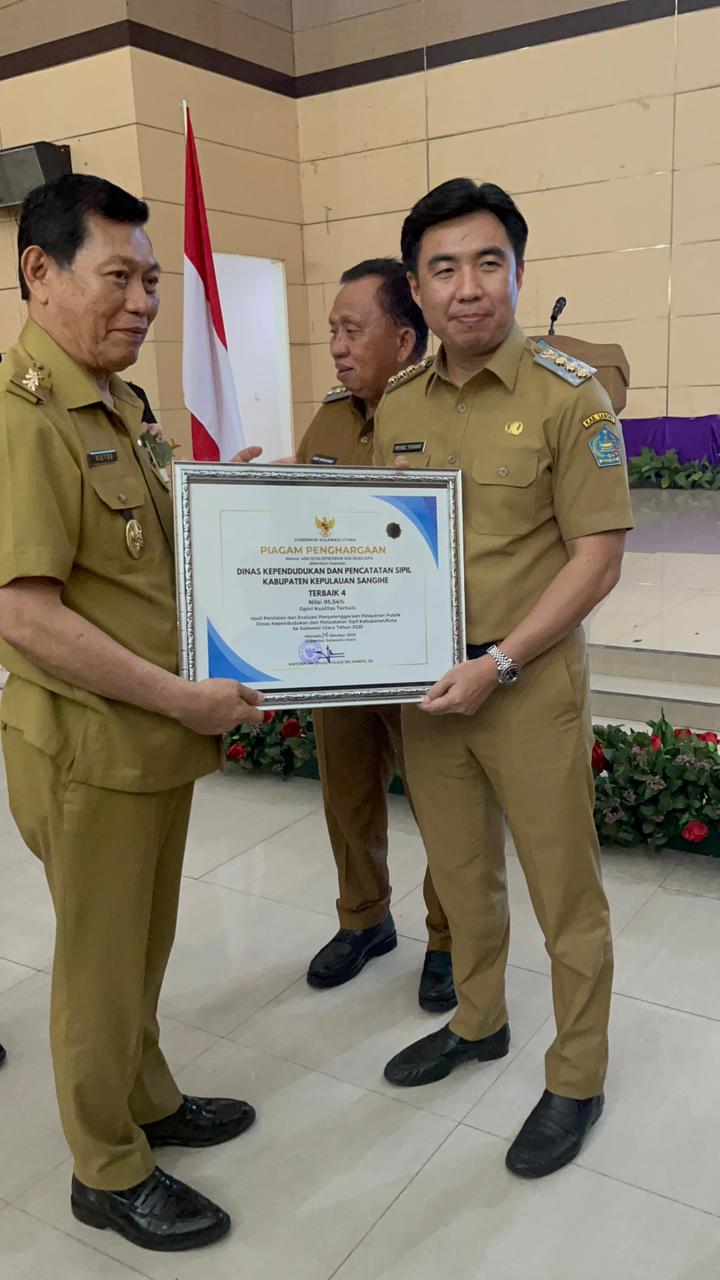 Dinas Dukcapil Sangihe berhasil meraih peringkat ke-4 se-Sulawesi Utara dengan nilai 95,54 dan memperoleh opini kualitas terbaik dalam penilaian serta evaluasi penyelenggaraan pelayanan publik tahun 2025.