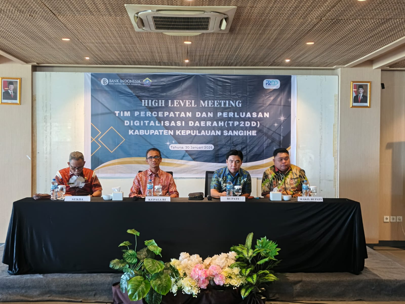 SANGIHE (Gawai.co) — Pemerintah Kabupaten Kepulauan Sangihe memperkuat pengendalian inflasi dan percepatan digitalisasi daerah melalui High Level Meeting Tim Pengendalian Inflasi Daerah (TPID) yang dirangkaikan dengan Tim Percepatan dan Perluasan Digitalisasi Daerah (TP2DD), di Ballroom Tahuna Beach Hotel, Jumat (30/1/2026).