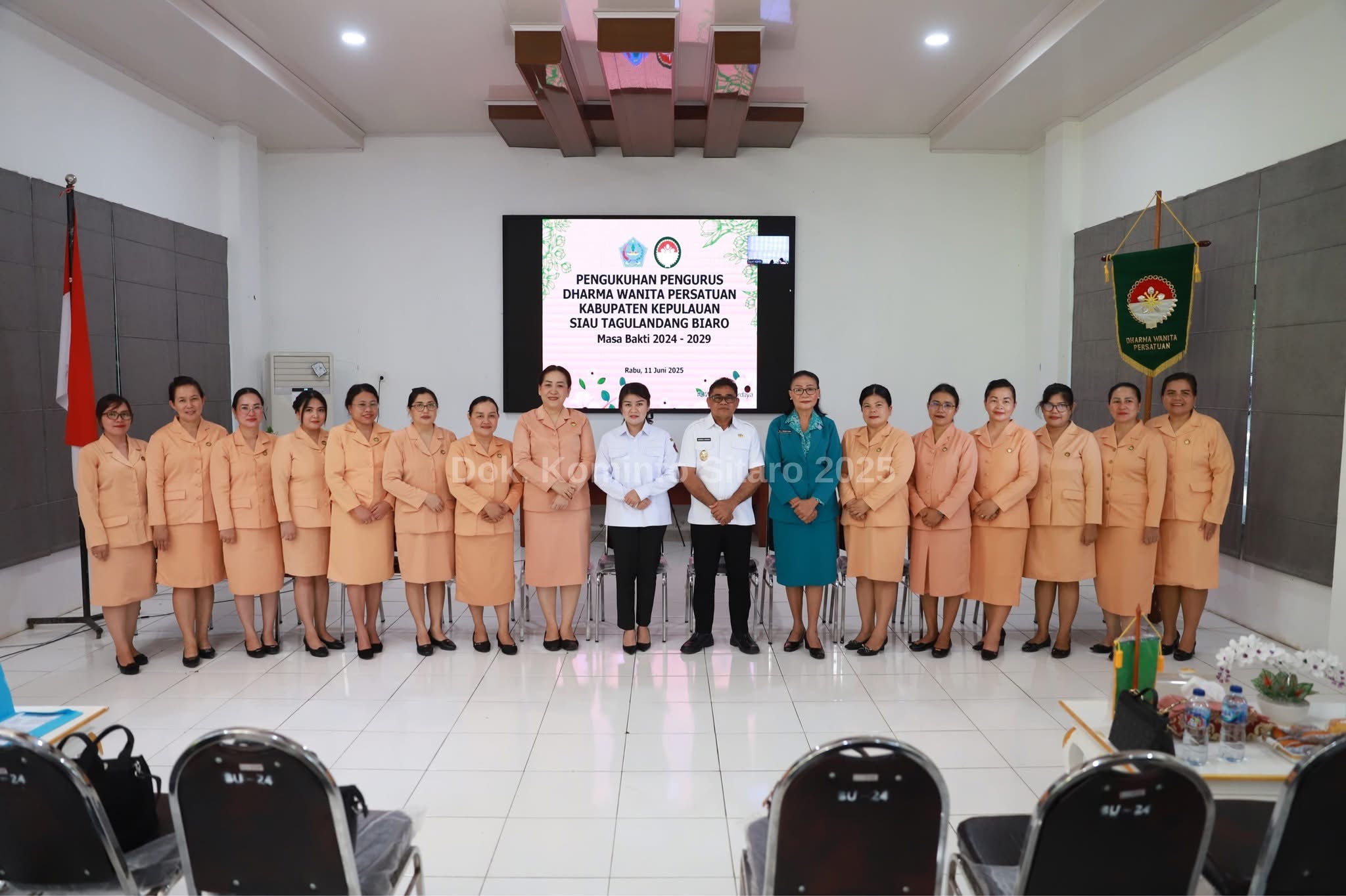 Bupati Sitaro Chyntia Inggrid Kalangit, Wakil Bupati Heronimus Makainas, dan Ketua TP-PKK Lesly Makainas-Sasiwu hadir dalam pengukuhan DWP masa bakti 2024–2029, di Media Center Kantor Bupati, Rabu (11/6/2025). (Dok: Kominfo Sitaro)