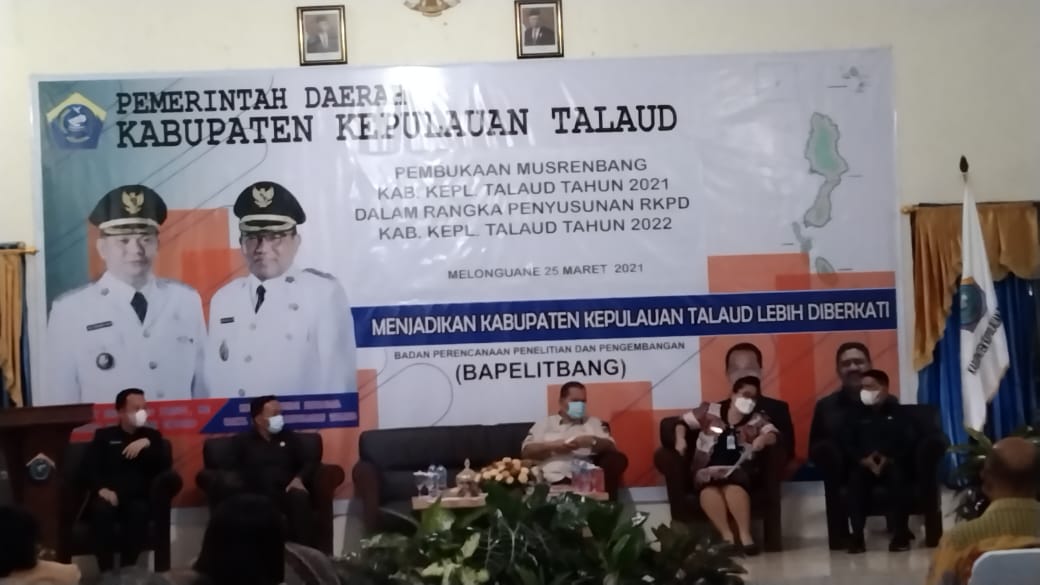 TALAUD (Gawai.co) – Bupati Kabupaten Kepulauan Elly Engelbert Lasut (E2L) Memimpin Pembukaan Musrembang Kabupaten di Badan Perencanaan Pembangunan Penelitian dan Pengembangan (BAPELITBANG) Kamis, (25/03). E2L mengatakan meski di suasana Covid-19 kita di dorong untuk meningkatkan berbagai aspek dalam kehidupan masyarakat.