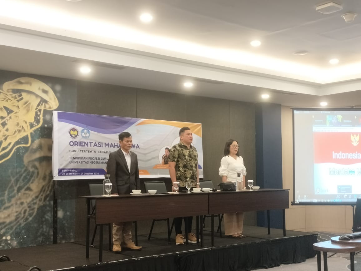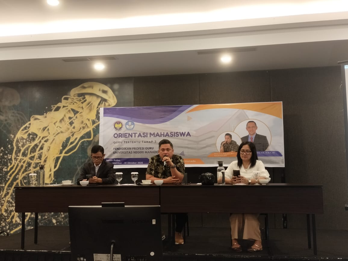 TONDANO (Gawai.co) – Universitas Negeri Manado (Unima) melalui Lembaga Pendidikan Profesi Guru (PPG) kembali menggelar Orientasi Mahasiswa Guru Tertentu Tahap 3 yang diikuti oleh 2.000 peserta secara virtual melalui Zoom maupun live Youtube, untuk dosen dan guru pamong dipusatkan di The Sentra Hotel Manado, Senin (29/9/2025).