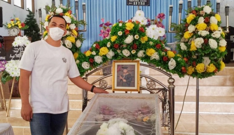 Valentino Sambuaga saat berpose disampaing peti keranda, sang kakanda Lerry Berry sehari sebelum ibadah pelepasan. (Ist)